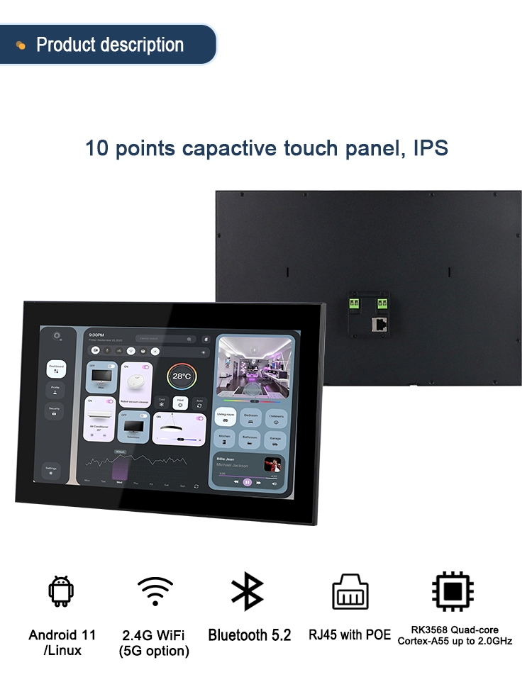 CP14P е модерен 14-инчов смарт тъч контролен панел, създаден за съвременни умни домове и офиси. Със своя 10-точков капацитивен IPS дисплей, процесор RK3568 Quad-Core Cortex-A55 и богати възможности за свързаност, този панел осигурява интуитивен и удобен интерфейс за управление на множество устройства и системи. Независимо дали контролирате осветление, системи за сигурност или климатизация, YC-SM14P предлага централизирано решение за всички ваши смарт устройства.