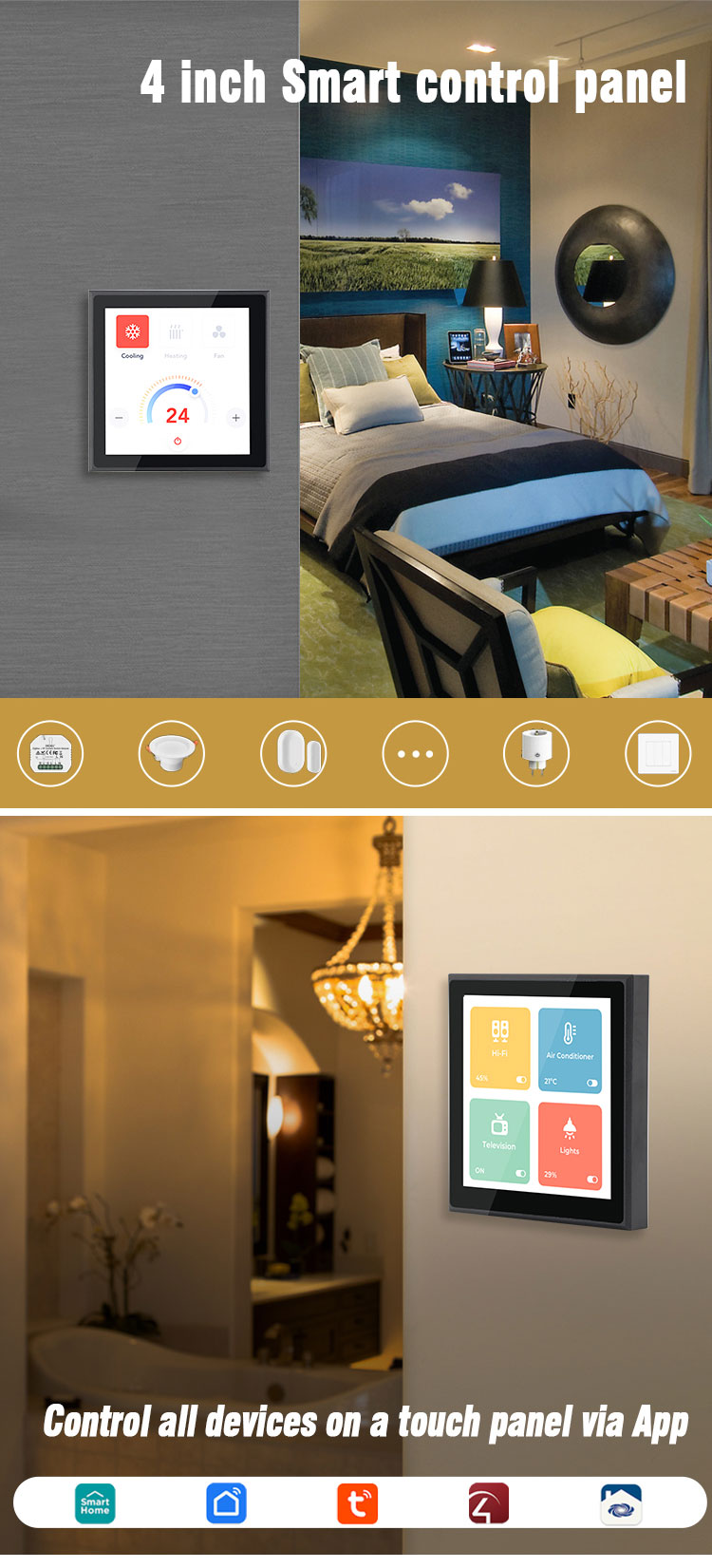 Smart Home дисплей CM41P е компактен и високоефективен сензорен контролен панел, предназначен за управление на интелигентни домове, офиси и хотели. Със своя елегантен черен дизайн и 4-инчов IPS дисплей, устройството осигурява удобен и интуитивен достъп до всички свързани смарт системи.