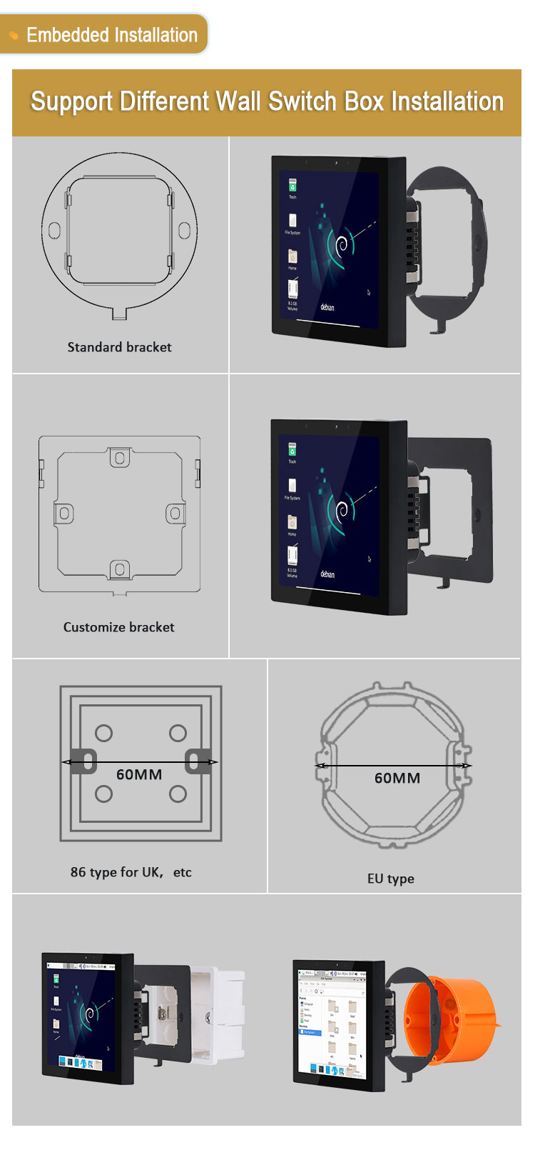 | Others | Installation | In-wall, suitable for EU, 86 wall box |