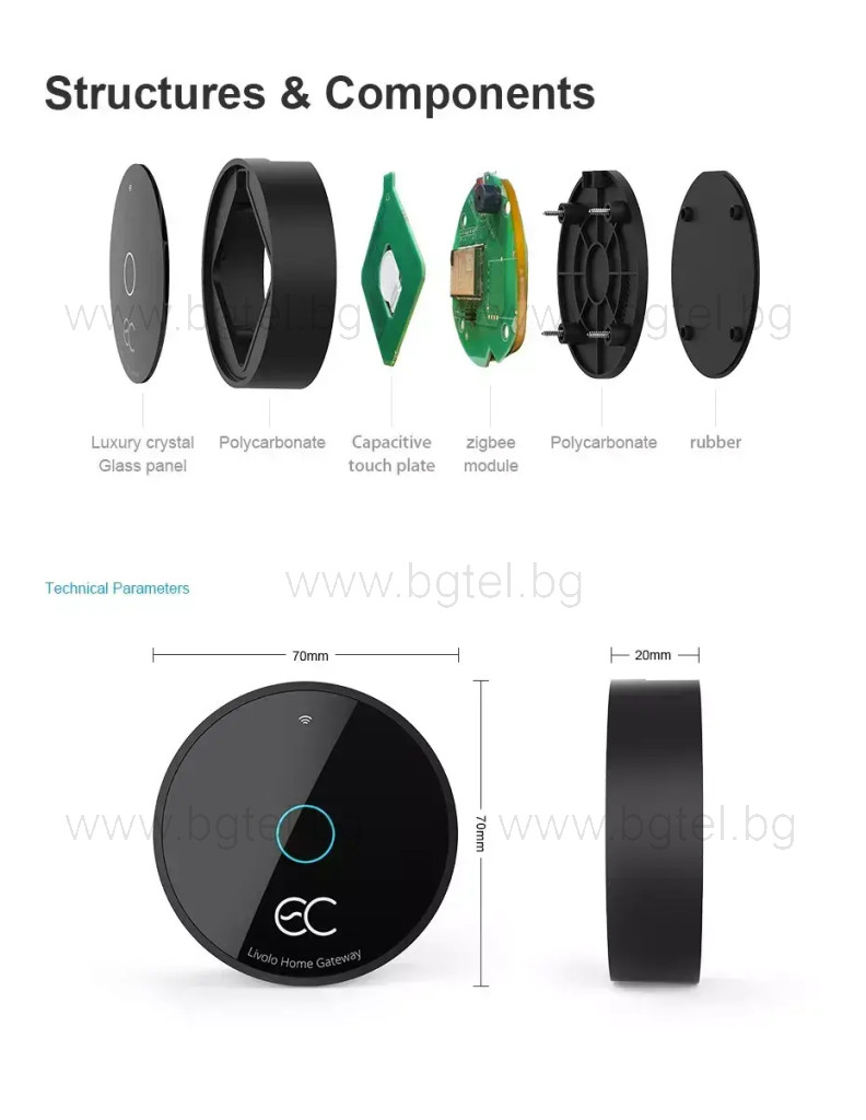 LIVOLO EC Gateway е предназначен да управлява всички Livolo EC устройства и да осъщесетвява контролът им както през програмата за мобилен телефон Livolo, така и чрез гласови команди от Amazon Alexa и Google Home устройства.
