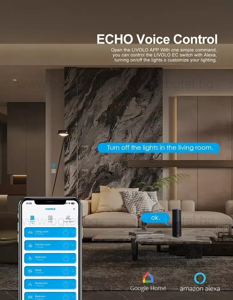 Livolo EC е стандарт направен специално за Smart Home оборудване. Интелигентният сензорен ключ EC може да се управлява с помощта на приложението LIVOLO, което позволява на потребителите да контролират дистанционно осветлението и превключвателите в дома си. Те също така са съвместими с гласовите асистенти Google Home и Amazon Alexa , така че могат лесно да се управляват с гласови команди.